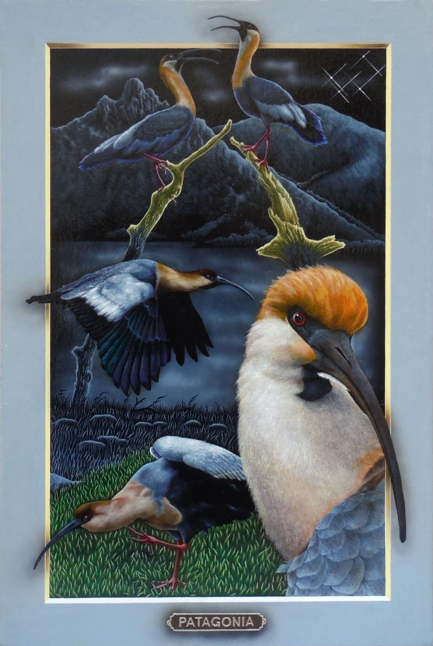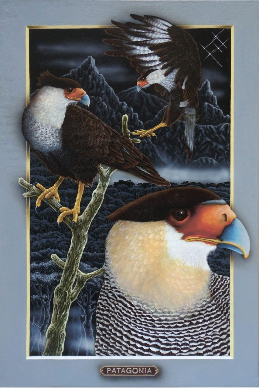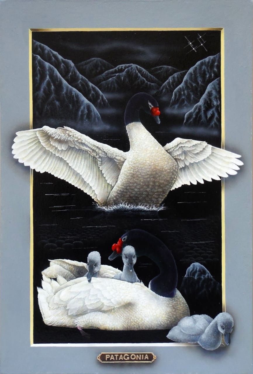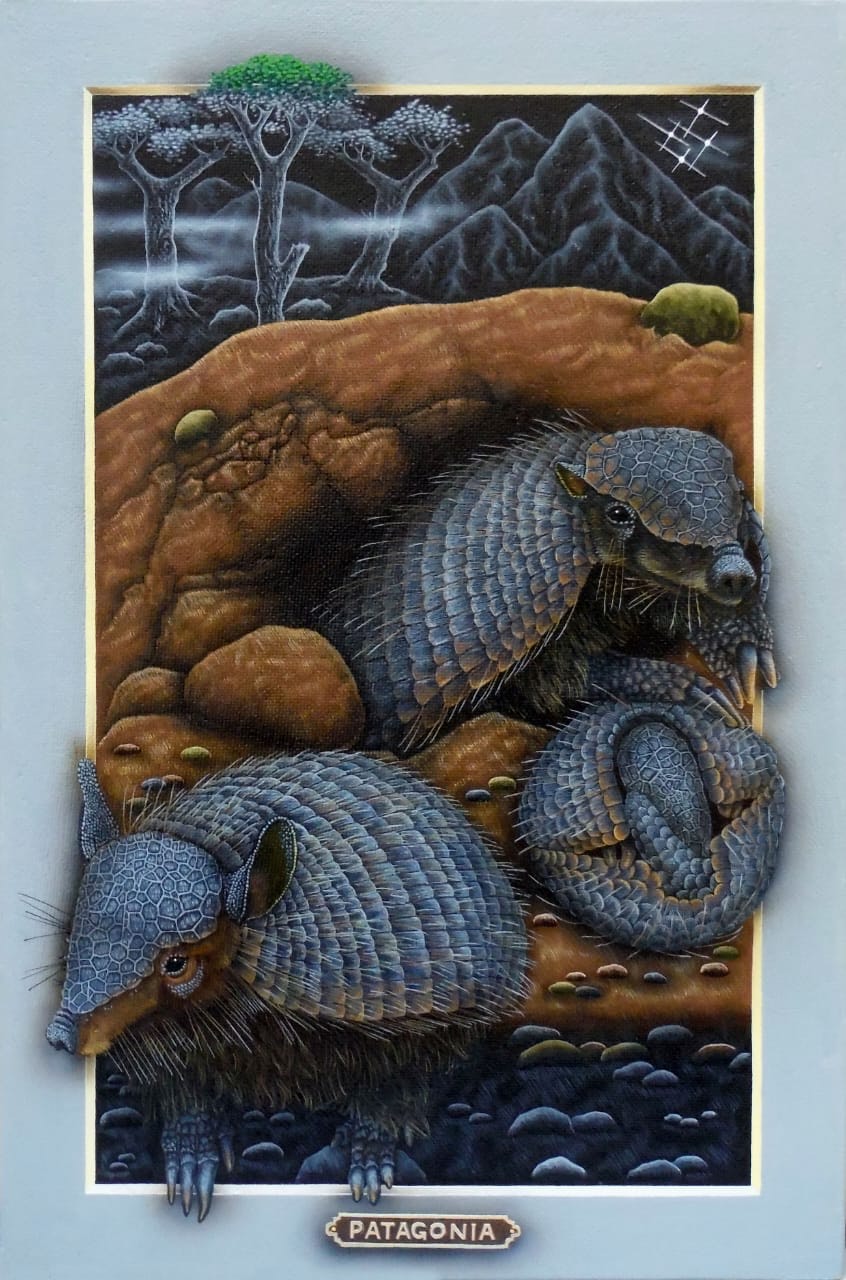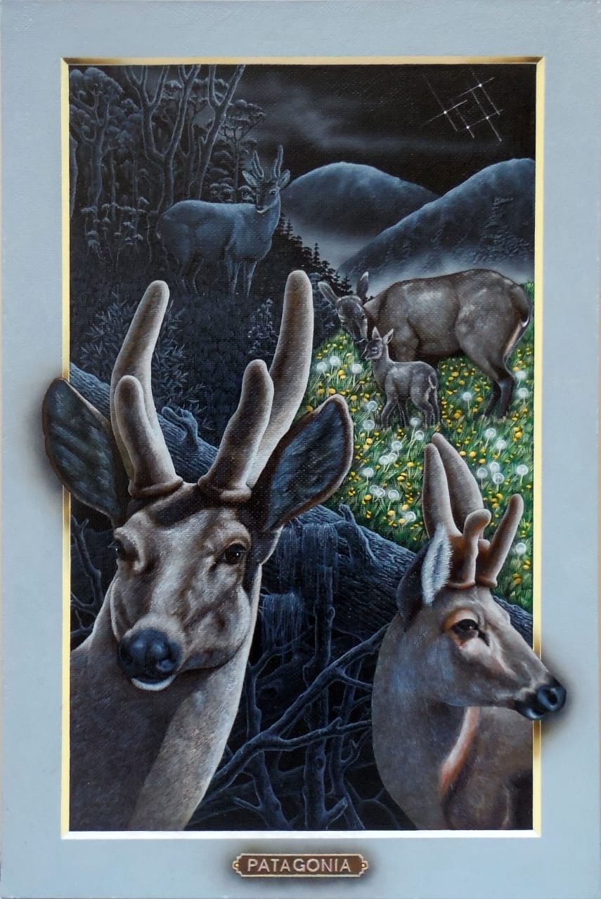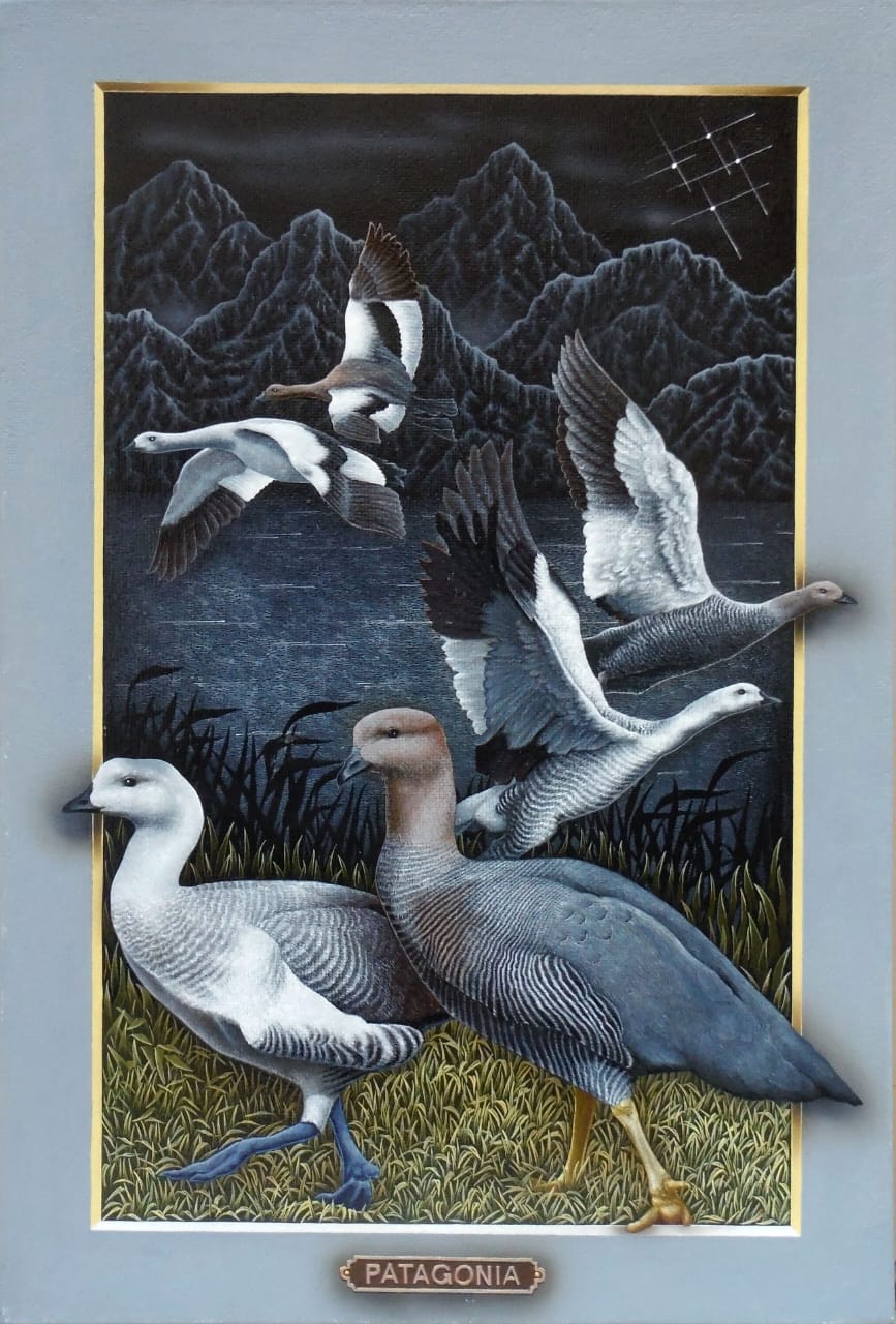 Los portales de Leonid tienen la fuerza de la conexión al yo interior y la canalización de la energía de la naturaleza. Una clara alusión a la plenitud del mundo natural. La luz frontal pone un foco tridimensional, exaltando a los protagonistas que desbordan los márgenes para abrazarnos, emergiendo de la oscuridad donde siempre está la cruz del sur. El oficio impecable de pintor en su pincelada preciosista nos interroga ¿Cómo habitamos el territorio? ¿Cómo nos vinculamos con nuestros animales?